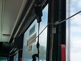 目的のバス停に近づいたら、窓のところにあるワイヤーを引っ張って、降車の合図をします。
