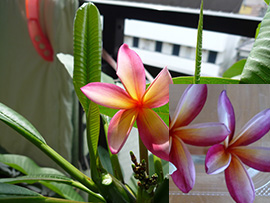 ハワイでレイなどに使われているポピュラーな花、そう、プルメリアです。