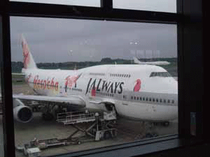 出発当日は成田空港に4時間前に到着。リゾッチャ塗装のジャンボに乗