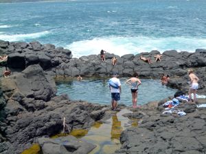 ここからトレッキングのような道を15分程度歩き、岩場に到着。結構人がいて、プール上のくぼみにみんな