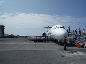 到着後、 コナ空港では、ボーディング・ブリッジなどなく、タラップが使用されるため、初めての体験なので不思議な感じであり、外に直接降りられるため、新鮮な空気と開放感を満喫できる。